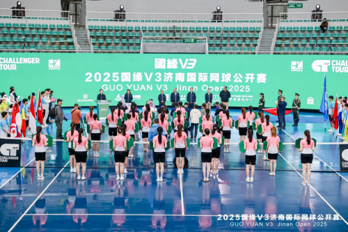 随后,开幕式正式开始。在庄严的国歌声中,全体人员行注目礼,爱国情怀与体育精神在此刻交融。随后,济南文旅集团党委副书记王锋致欢迎辞。他表示,2025国缘V3济南国际网球公开赛是济南第六次举办的国际网球高规格赛事,既是高水平体育盛会的延续,更是连接世界、深化友谊的桥梁,将为这座历史文化名城注入时尚活力与运动脉搏。济南文旅集团将全力以赴提供优质服务与舒适体验,为ATP与WTA双赛联动的体育盛宴保驾护航。